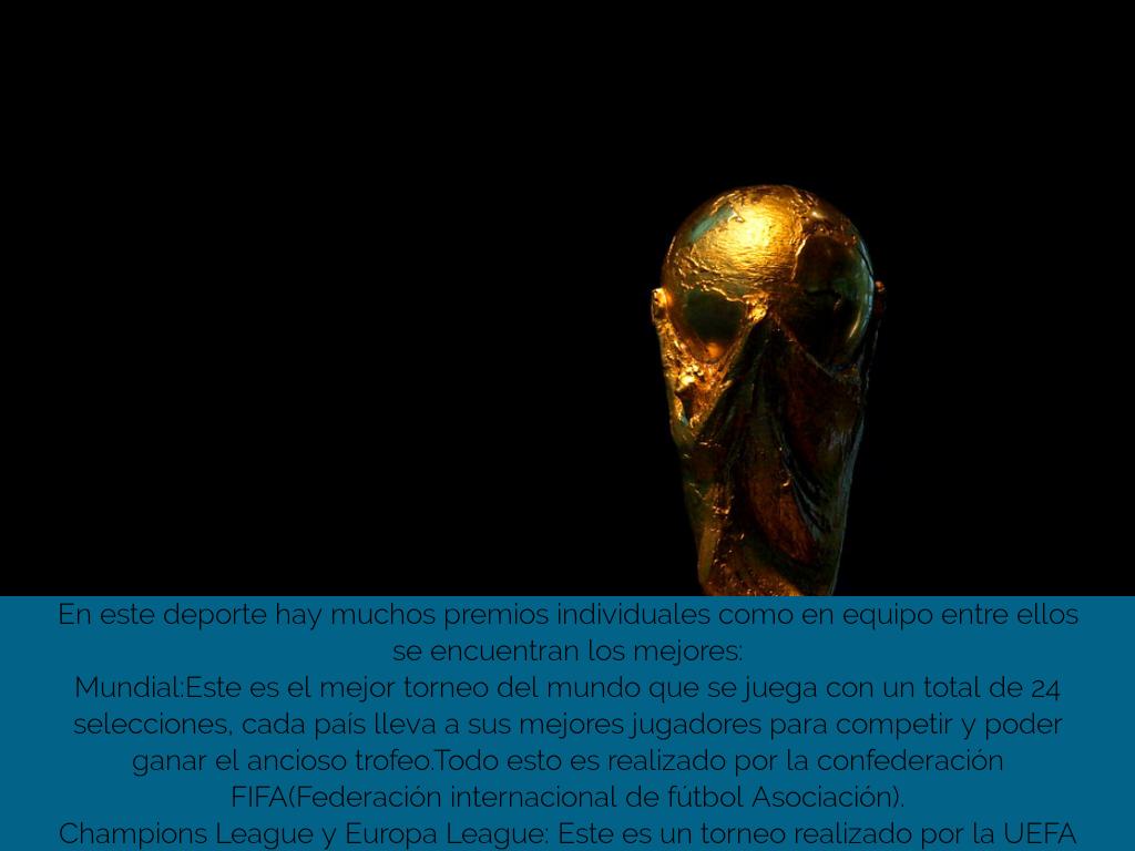 Balón de oro: este es un premio que obtiene el mejor jugador del año sea goleador, asistidas o por haber jugado mejor que los demás jugadores. Este premio tiene el aspecto de un balón bañado en oro como lo dice su nombre, este premio se entrega en una enorme gala en donde se encuentra los mejores jugadores de ese año que fueron nominados a ganarlo