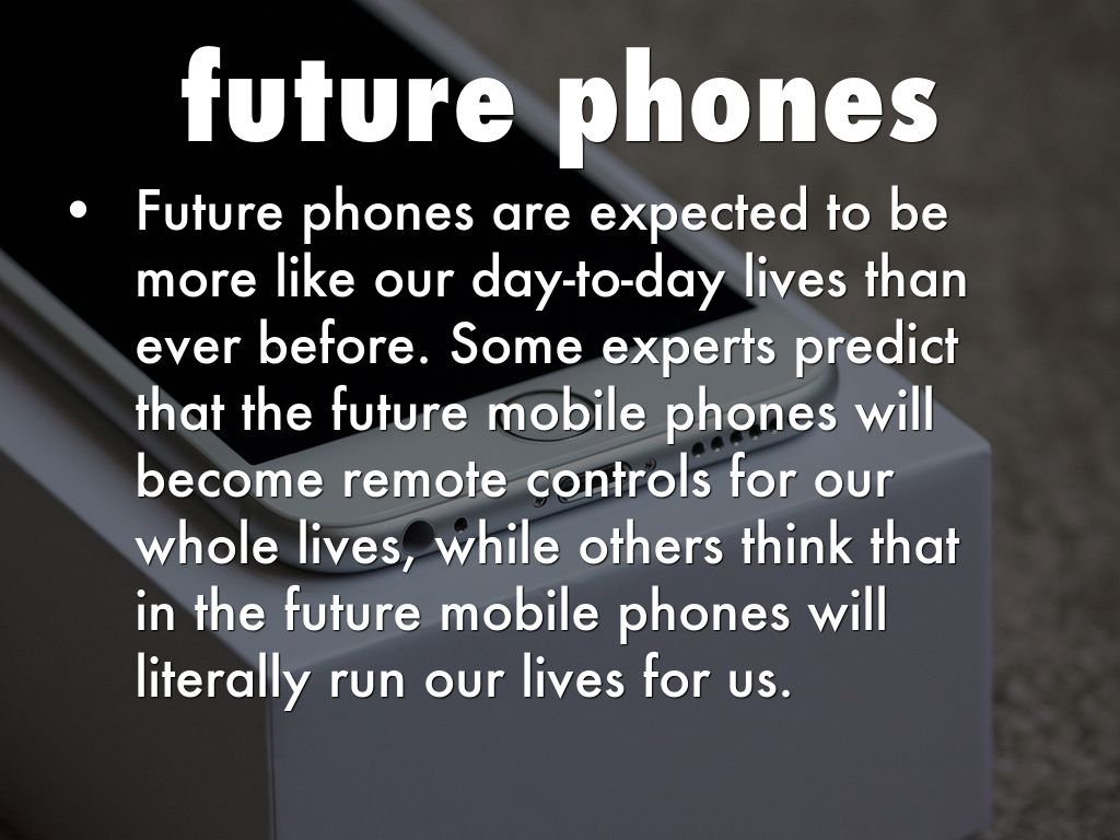 Future phones are expected to be more like our day-to-day lives than ever before. Some experts predict that the future mobile phones will become remote controls for our whole lives, while others think that in the future mobile phones will literally run our lives for us.