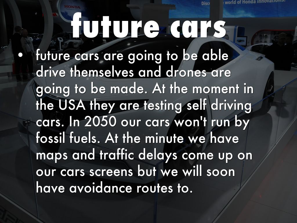 future cars are going to be able drive themselves and drones are going to be made. At the moment in the USA they are testing self driving cars. In 2050 our cars won't run by fossil fuels. At the minute we have maps and traffic delays come up on our cars screens but we will soon have avoidance routes to.
