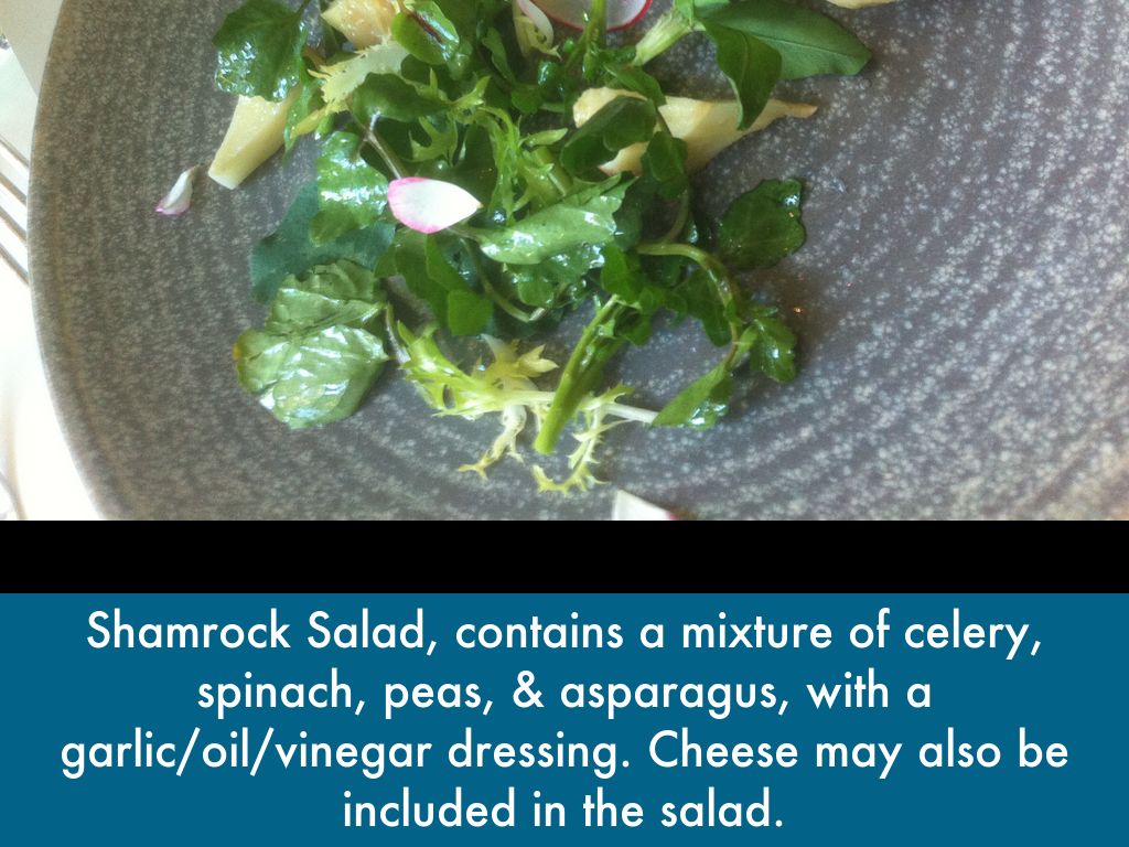 Shamrock Salad, contains a mixture of celery, spinach, peas, & asparagus, with a garlic/oil/vinegar dressing. Cheese may also be included in the salad.
