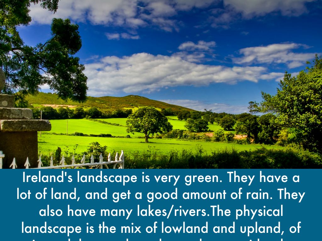 Ireland's landscape is very green. They have a lot of land, and get a good amount of rain. They also have many lakes/rivers.The physical landscape is the mix of lowland and upland, of rivers, lakes, and seashores that provides the arena for life in Ireland. It influences the food they eat and the water they drink.