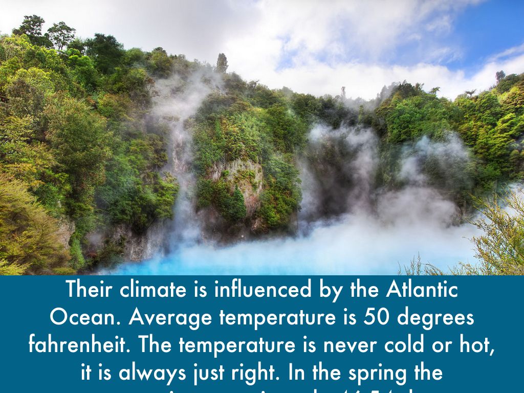 Their climate is influenced by the Atlantic Ocean. Average temperature is 50 degrees fahrenheit. The temperature is never cold or hot, it is always just right. In the spring the temperature is approximately 46-54 degrees and in the summer the temperature is about 60-68 degrees Fahrenheit.