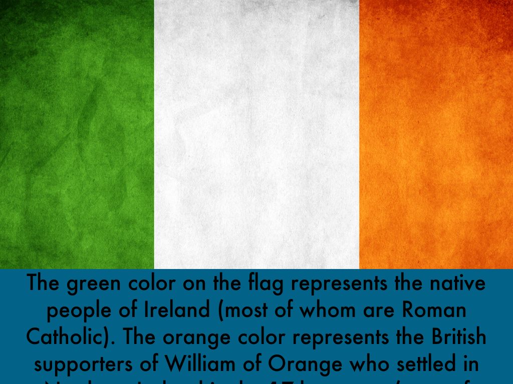 The green color on the flag represents the native people of Ireland (most of whom are Roman Catholic). The orange color represents the British supporters of William of Orange who settled in Northern Ireland in the 17th century (most of whom are Protestant).