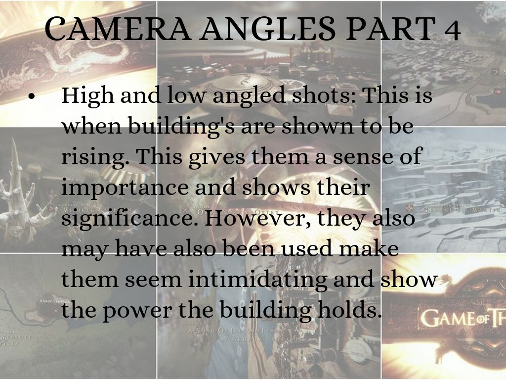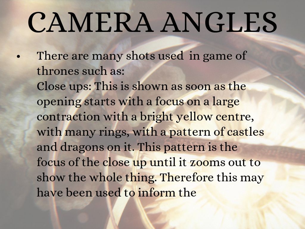 • There are many shots used in game of thrones such as: Close ups: This is shown as soon as the opening starts with a focus on a large contraction with a bright yellow centre, with many rings, with a pattern of castles and dragons on it. This pattern is the focus of the close up until it zooms out to show the whole thing. Therefore this may have been used to inform the