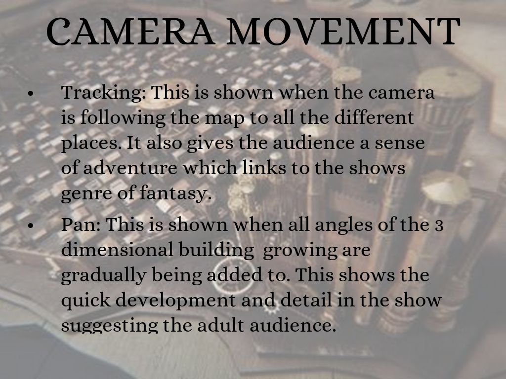 • Tracking: This is shown when the camera is following the map to all the different places. It also gives the audience a sense of adventure which links to the shows genre of fantasy.