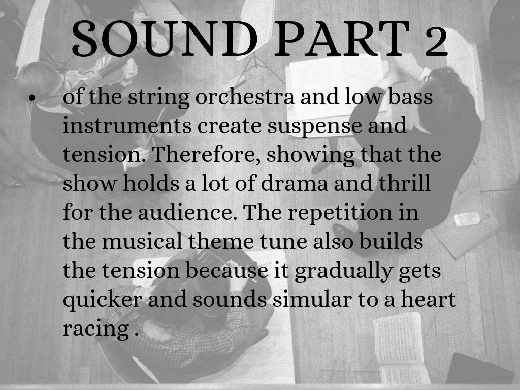 • of the string orchestra and low bass instruments create suspense and tension. Therefore, showing that the show holds a lot of drama and thrill for the audience. The repetition in the musical theme tune also builds the tension because it gradually gets quicker and sounds simular to a heart racing .