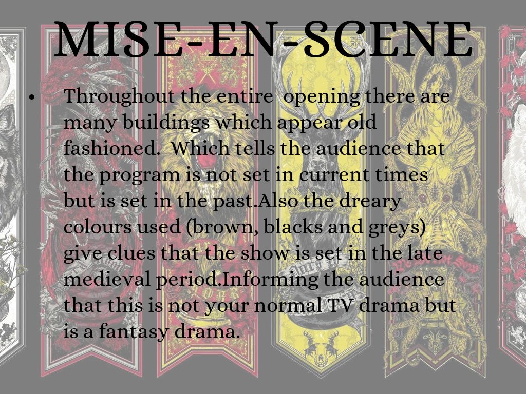 • Throughout the entire opening there are many buildings which appear old fashioned. Which tells the audience that the program is not set in current times but is set in the past.Also the dreary colours used (brown, blacks and greys) give clues that the show is set in the late medieval period.Informing the audience that this is not your normal TV drama but is a fantasy drama.