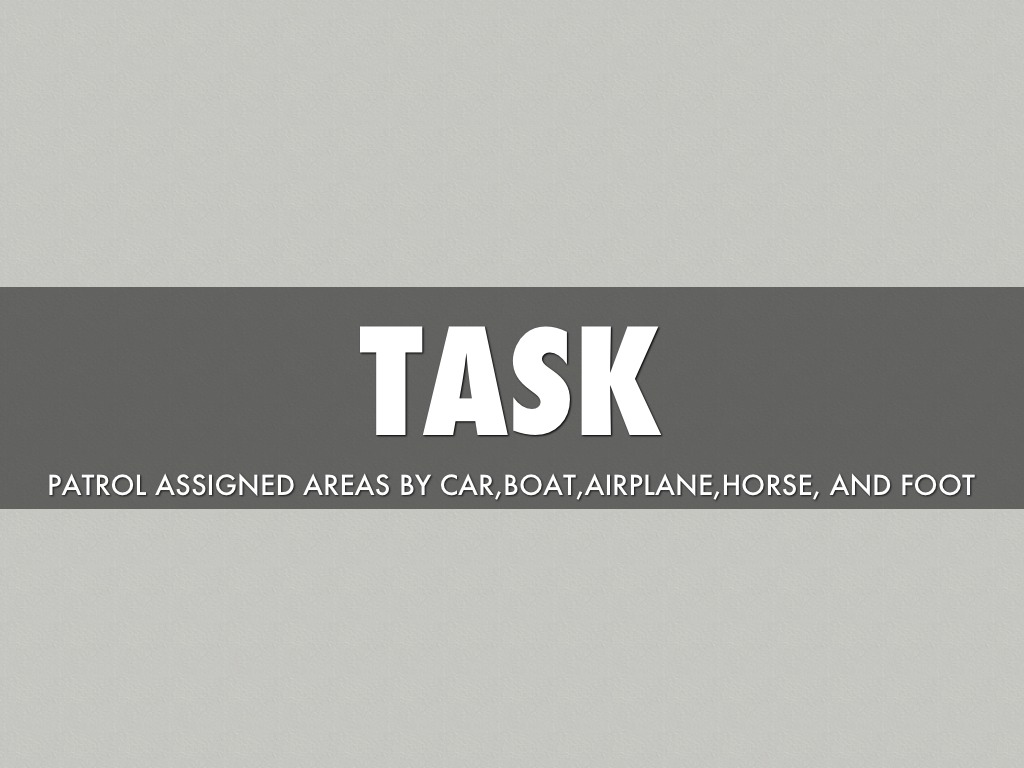 PATROL ASSIGNED AREAS BY CAR,BOAT,AIRPLANE,HORSE, AND FOOT