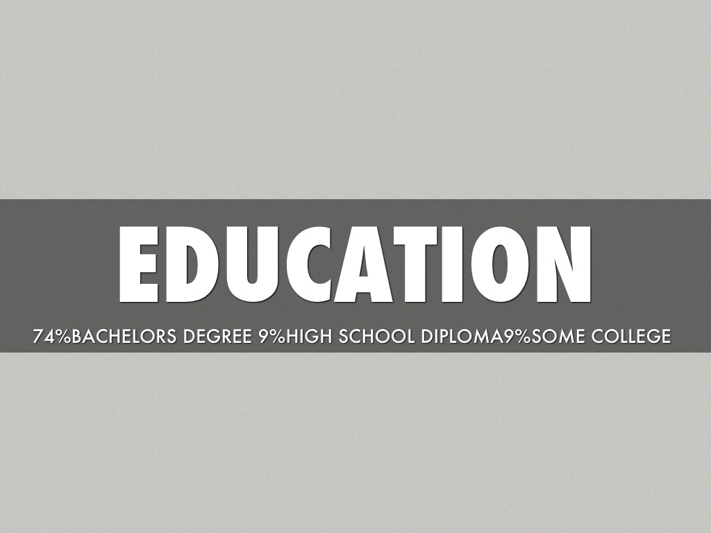 74%BACHELORS DEGREE 9%HIGH SCHOOL DIPLOMA9%SOME COLLEGE