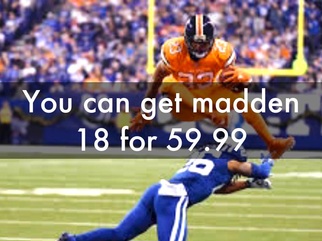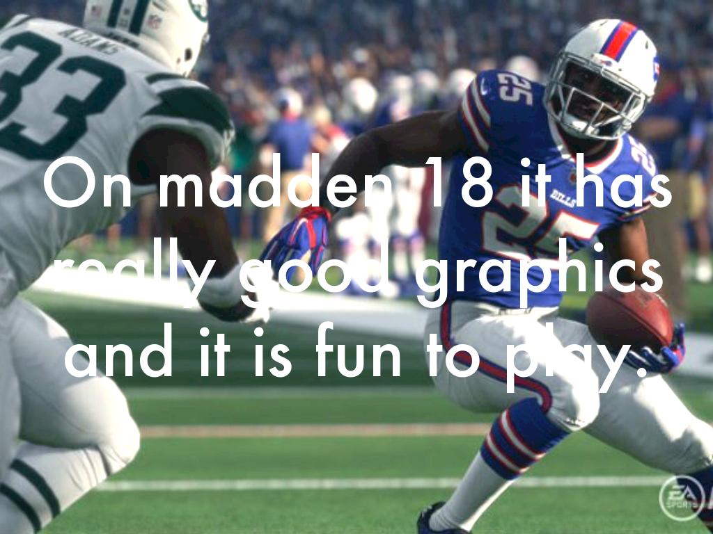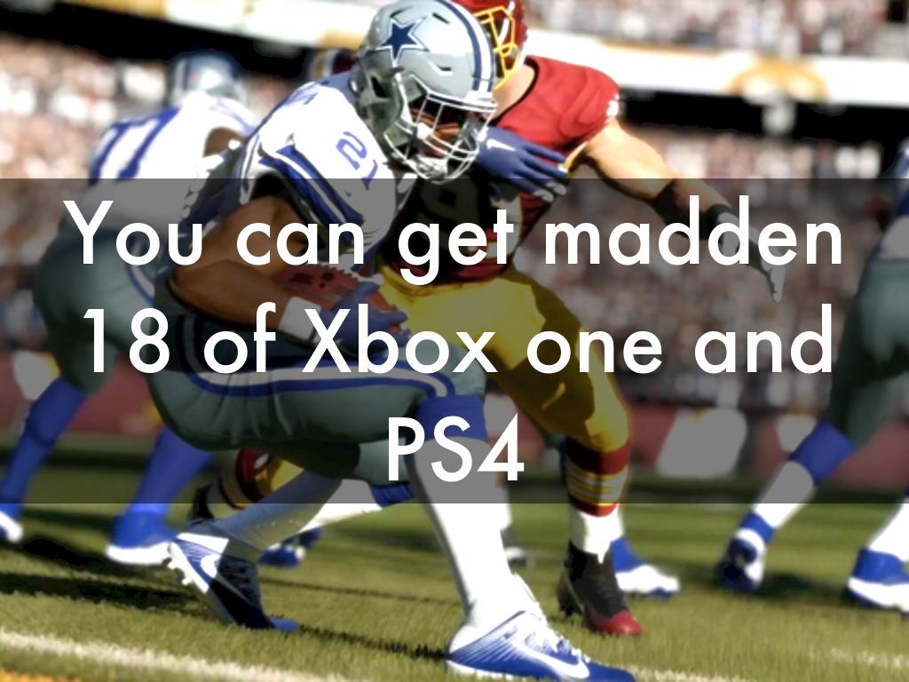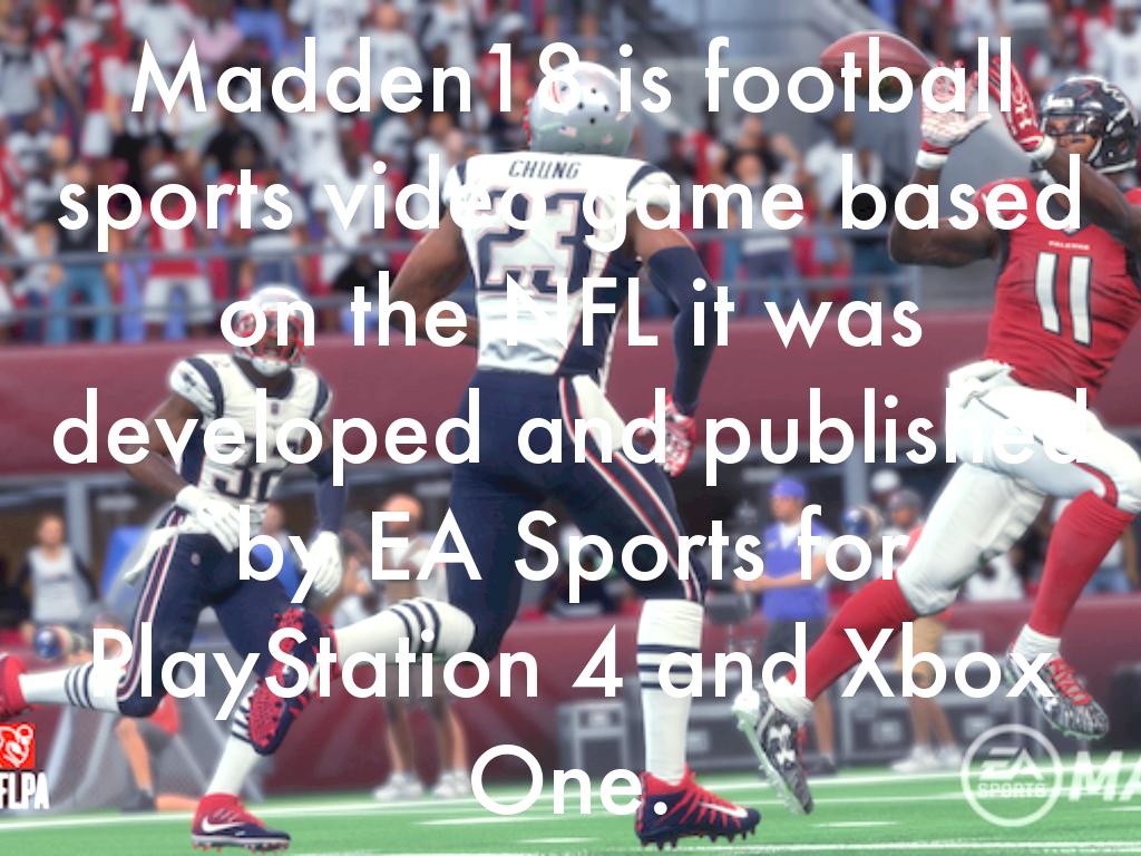 Madden18 is football sports video game based on the NFL it was developed and published by EA Sports for PlayStation 4 and Xbox One.