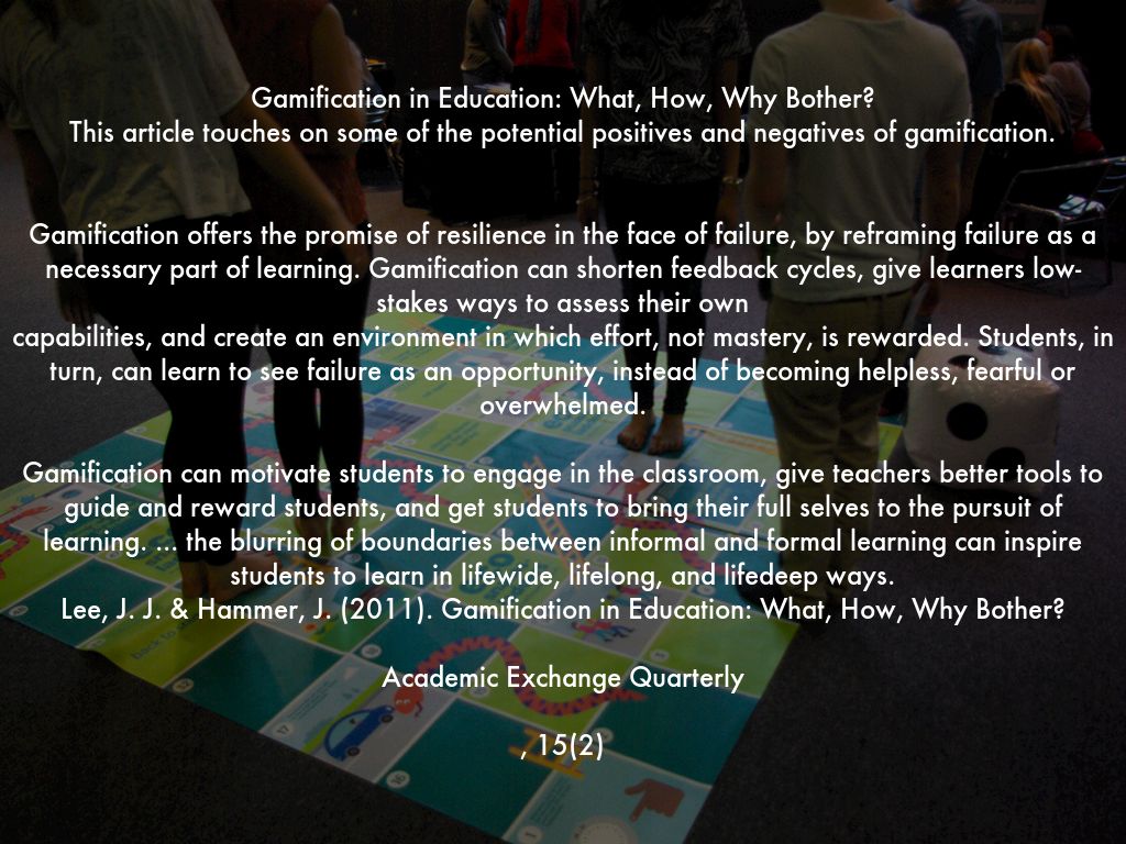 Lee, J. J. & Hammer, J. (2011). Gamification in Education: What, How, Why Bother?