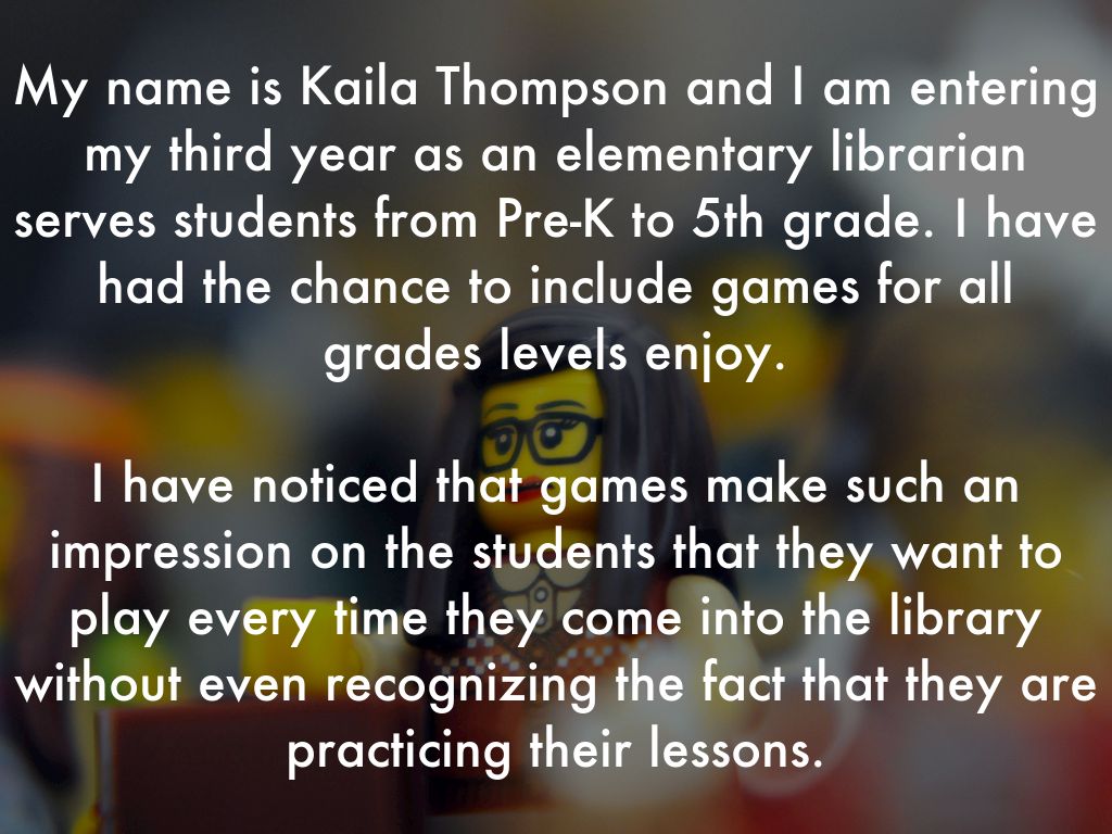 My name is Kaila Thompson and I am entering my third year as an elementary librarian serves students from Pre-K to 5th grade. I have had the chance to include games for all grades levels enjoy.