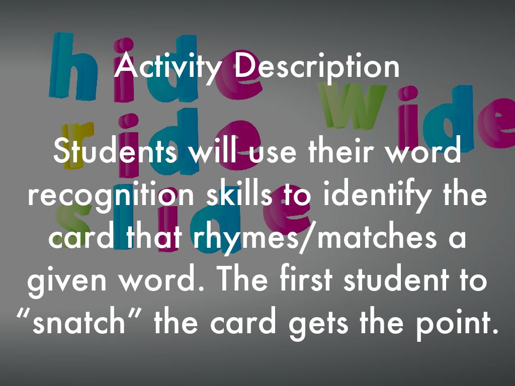 Students will use their word recognition skills to identify the card that rhymes/matches a given word. The first student to “snatch” the card gets the point.