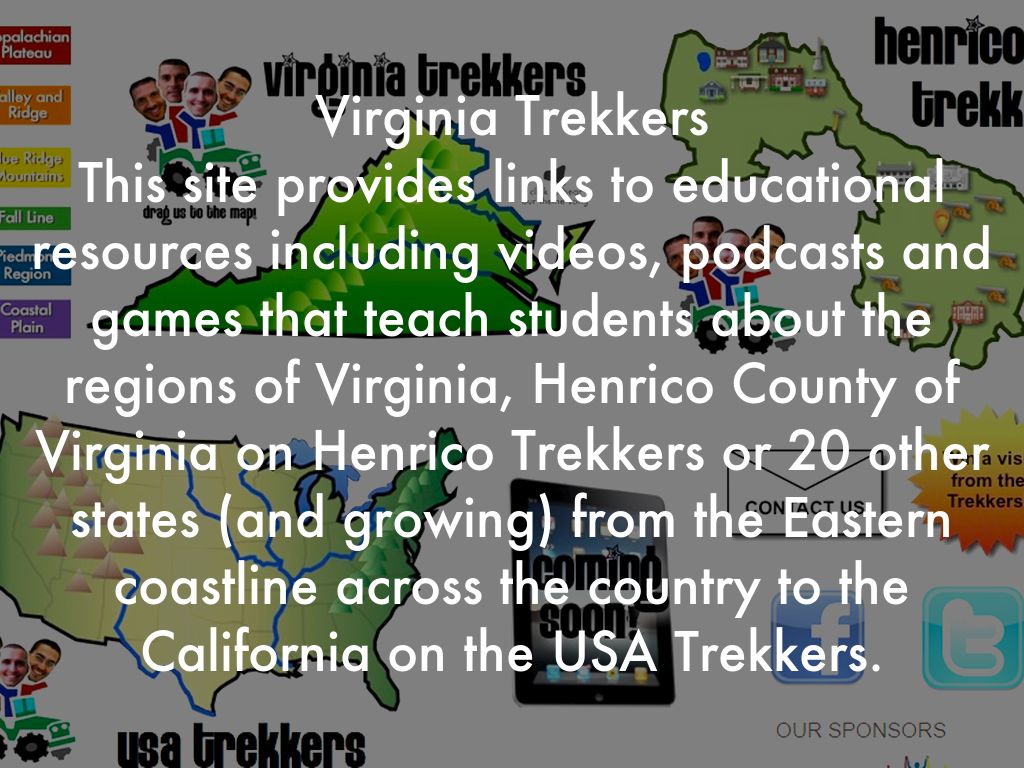 This site provides links to educational resources including videos, podcasts and games that teach students about the regions of Virginia, Henrico County of Virginia on Henrico Trekkers or 20 other states (and growing) from the Eastern coastline across the country to the California on the USA Trekkers.