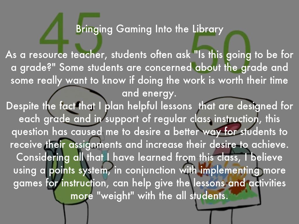 However, I have desired to expand my understanding of how to use gaming as an instructional tool; therefore, I took a class to help me learn about the place of gaming in the classroom and, in my case, the school library.