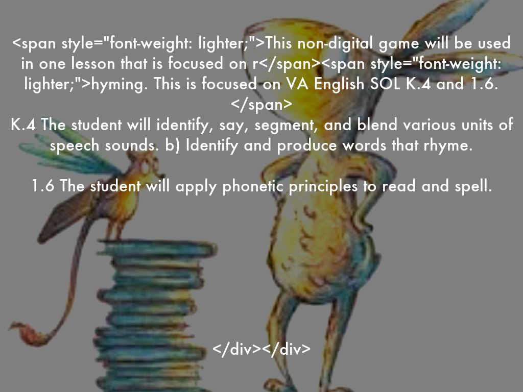 This non-digital game will be used in one lesson that is focused on rhyming. This is focused on VA English SOL K.4 and 1.6.