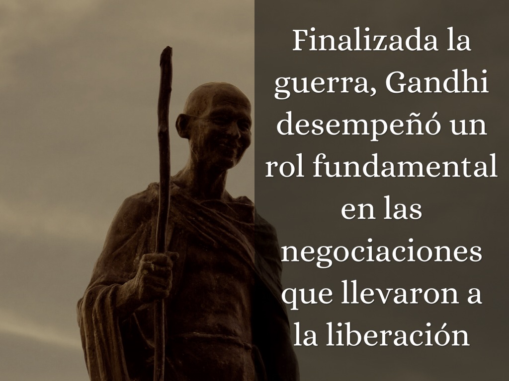 Finalizada la guerra, Gandhi desempeñó un rol fundamental en las negociaciones que llevaron a la liberación