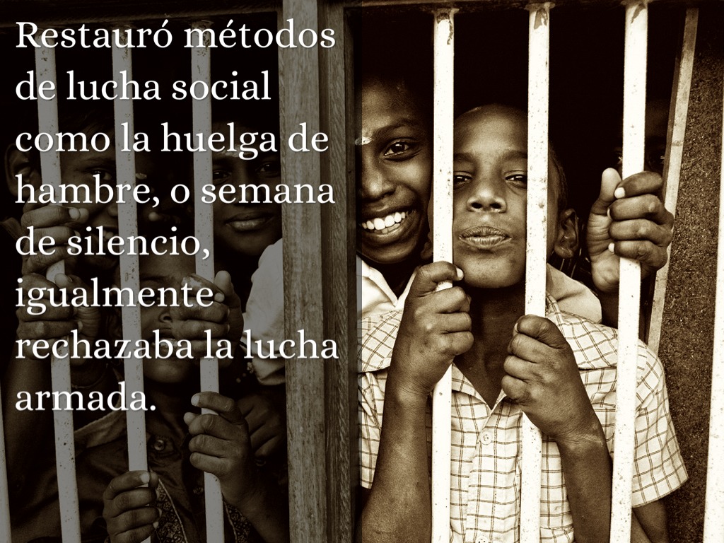 Restauró métodos de lucha social como la huelga de hambre, o semana de silencio, igualmente rechazaba la lucha armada.