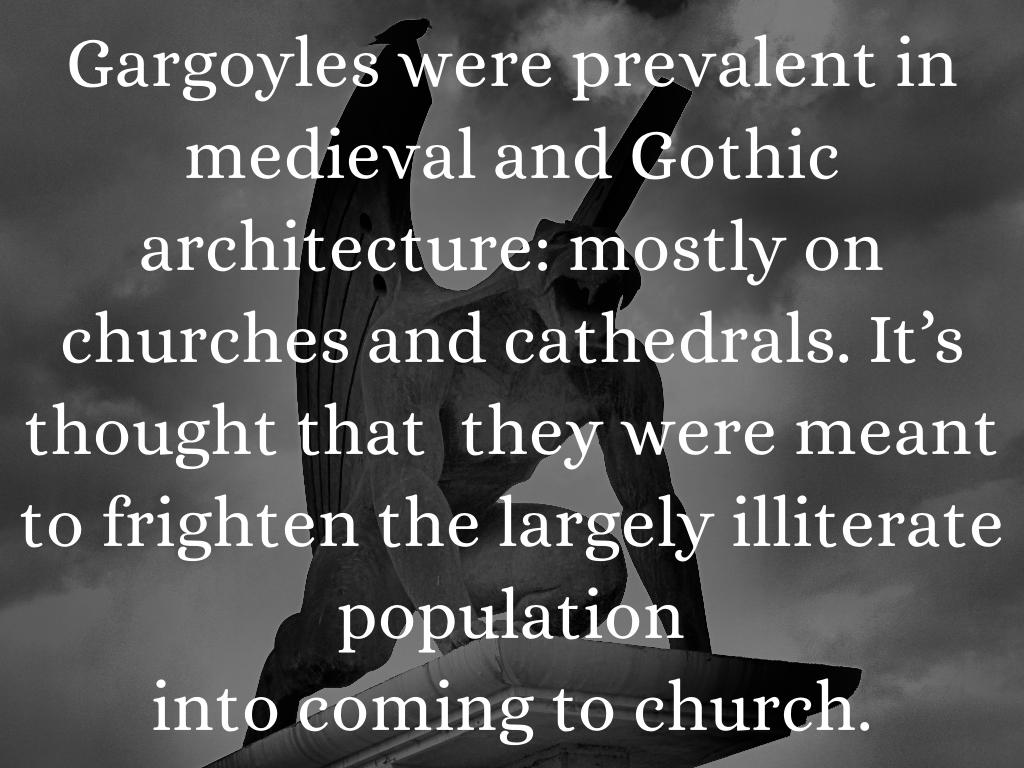 Gargoyles were prevalent in medieval and Gothic architecture: mostly on churches and cathedrals. It’s thought that they were meant to frighten the largely illiterate population into coming to church.