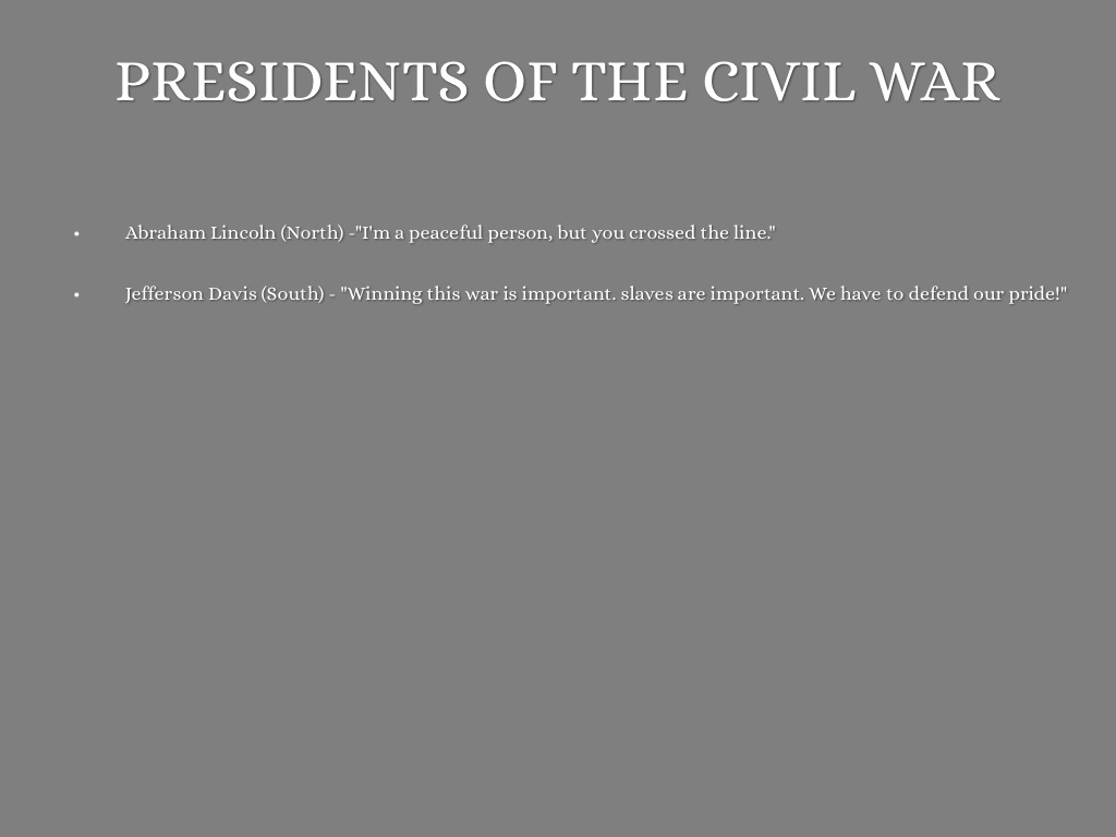 Jefferson Davis (South) - "Winning this war is important. slaves are important. We have to defend our pride!"