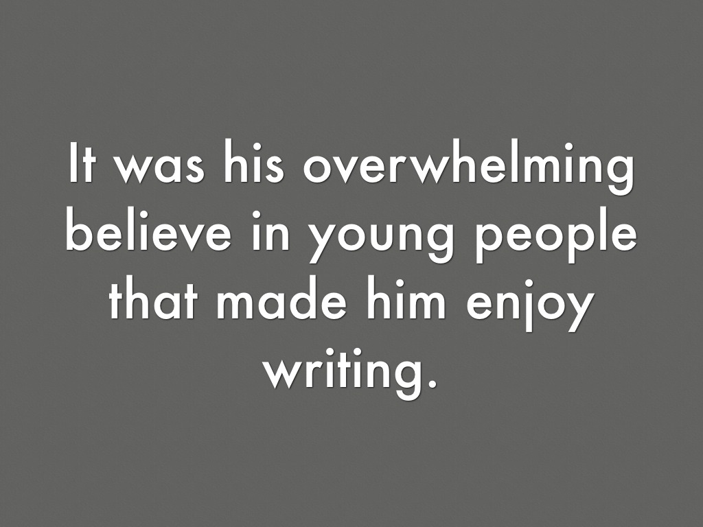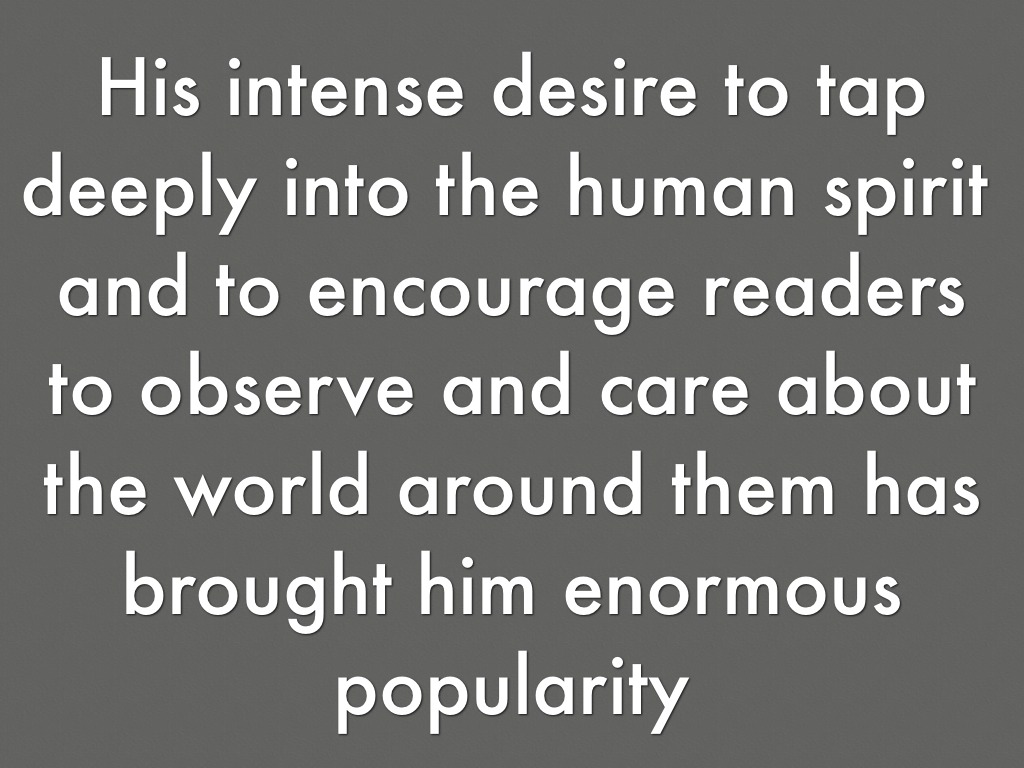 His intense desire to tap deeply into the human spirit and to encourage readers to observe and care about the world around them has brought him enormous popularity