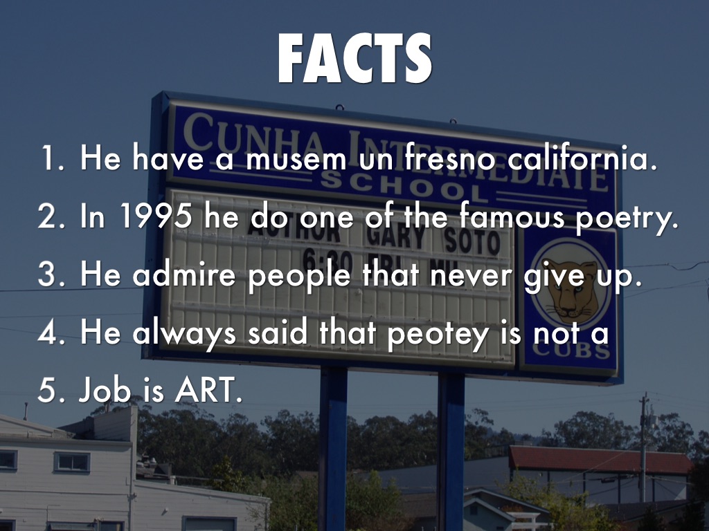 Gary Soto, born April 12, 1952, was raised in Fresno, California. He is the author of eleven poetry collections for adults, most notably New and Selected Poems, a 1995 finalist for both the Los Angeles Times Book Award and the National Book Award. His poems have appeared in many literary magazines, including Ploughshares, Michigan Quarterly, Poetry International, and Poetry, which