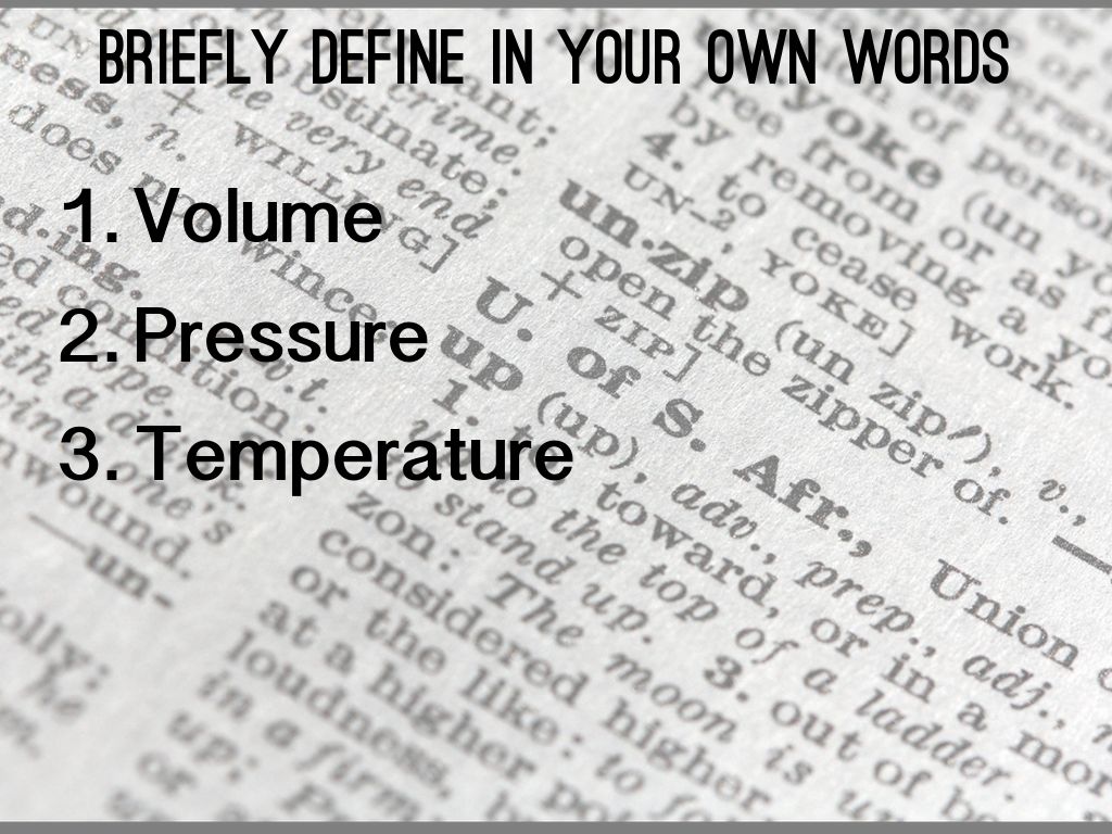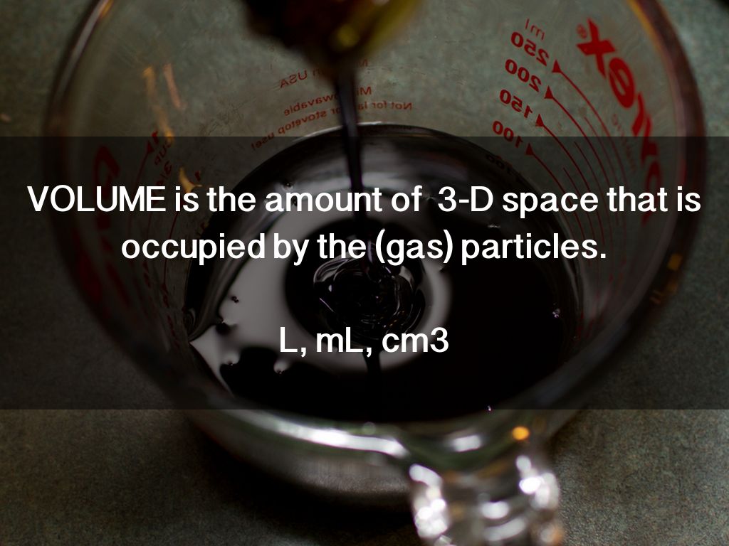VOLUME is the amount of 3-D space that is occupied by the (gas) particles.