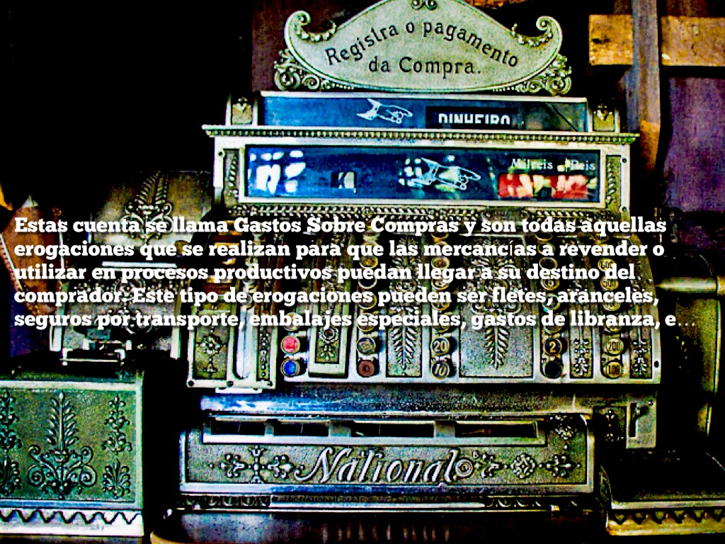 Estas cuenta se llama Gastos Sobre Compras y son todas aquellas erogaciones que se realizan para que las mercancías a revender o utilizar en procesos productivos puedan llegar a su destino del comprador. Este tipo de erogaciones pueden ser fletes, aranceles, seguros por transporte, embalajes especiales, gastos de libranza, etc.