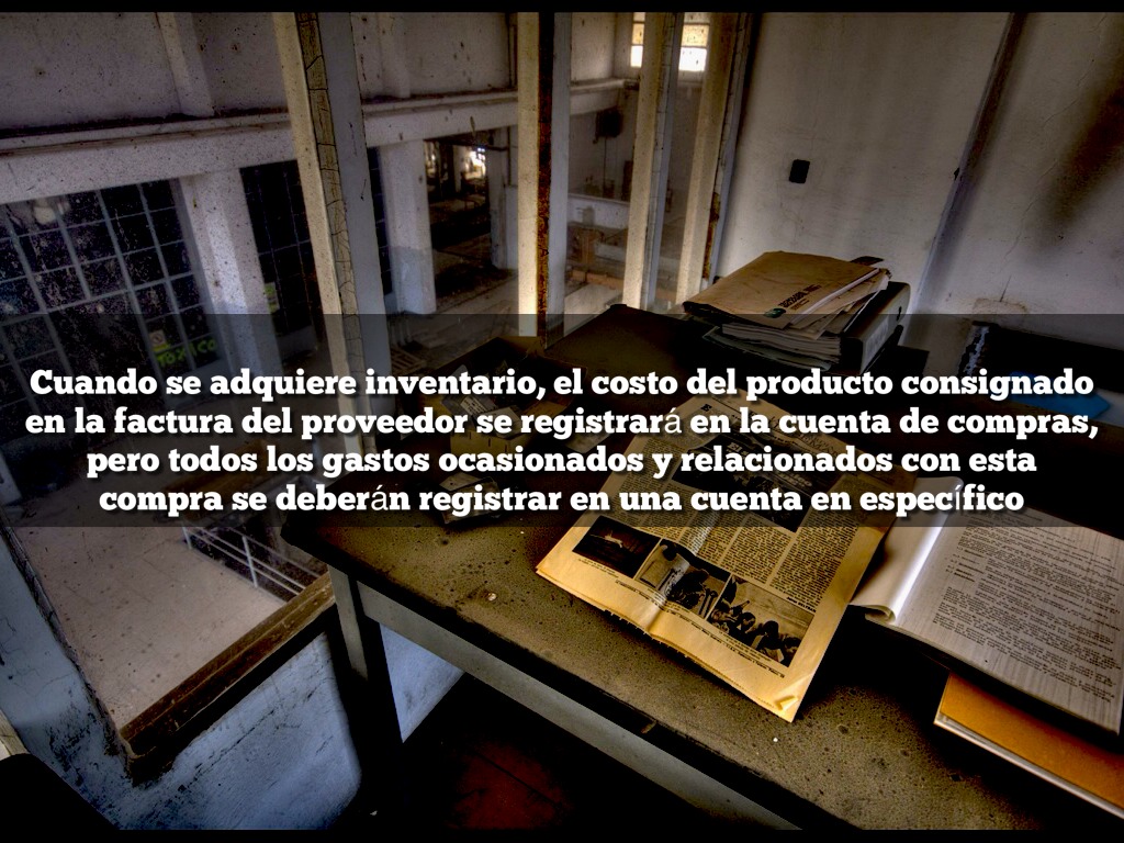 Cuando se adquiere inventario, el costo del producto consignado en la factura del proveedor se registrará en la cuenta de compras, pero todos los gastos ocasionados y relacionados con esta compra se deberán registrar en una cuenta en específico