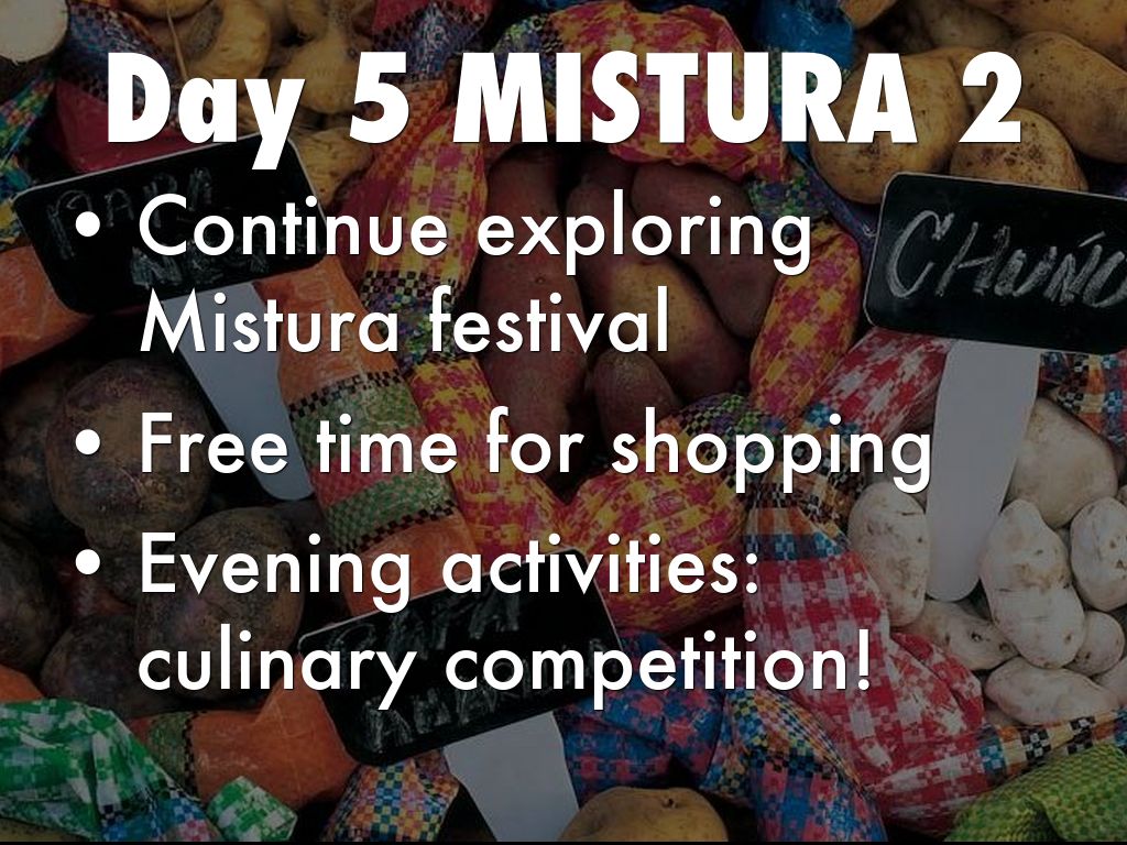 • Dinner in ''Peru Star" restaurant + wine and dine ''Peruvian cuisine" discussion.