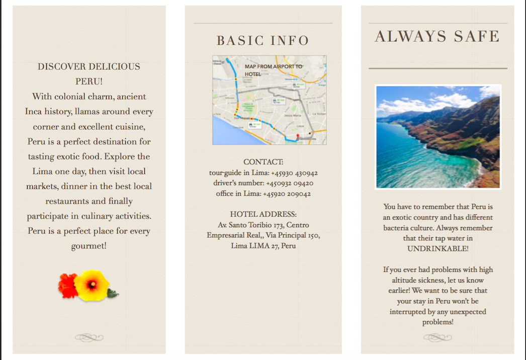 • TRIP OPTIONS: A. Voluntary trip to Machu Picchu B. El Pisquerito bar with dozens of types of Pisco and cocktails.