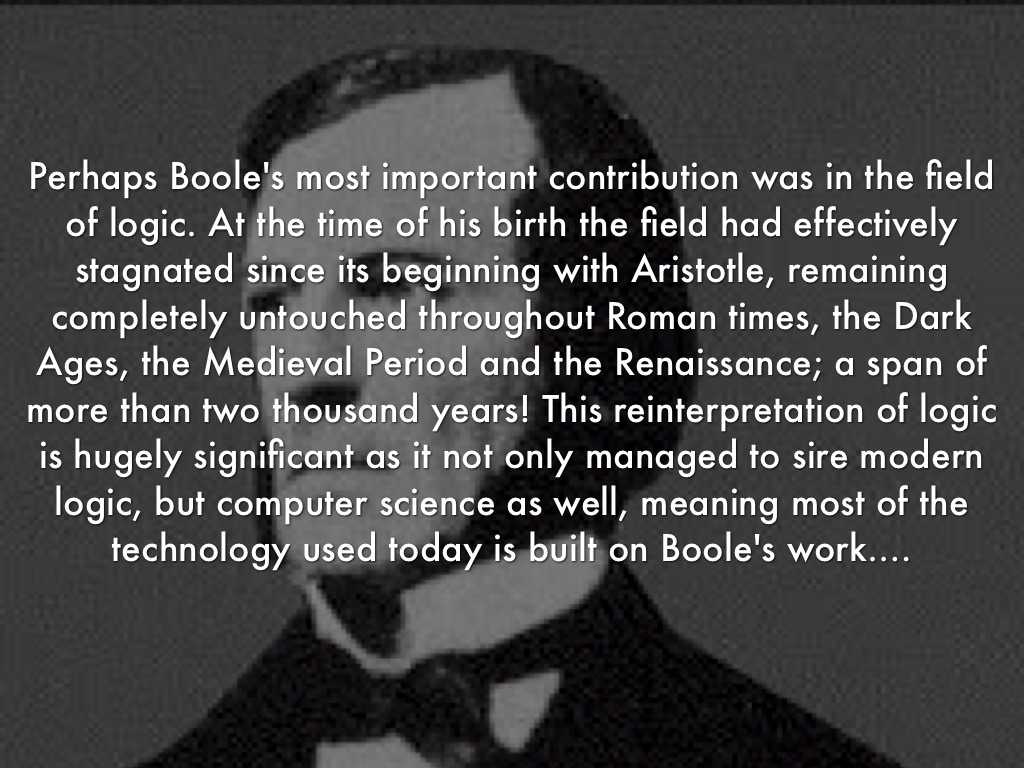 Perhaps Boole's most important contribution was in the field of logic. At the time of his birth the field had effectively stagnated since its beginning with Aristotle, remaining completely untouched throughout Roman times, the Dark Ages, the Medieval Period and the Renaissance; a span of more than two thousand years! This reinterpretation of logic is hugely significant as it not only managed to sire modern logic, but computer science as well, meaning most of the technology used today is built on Boole's work.
