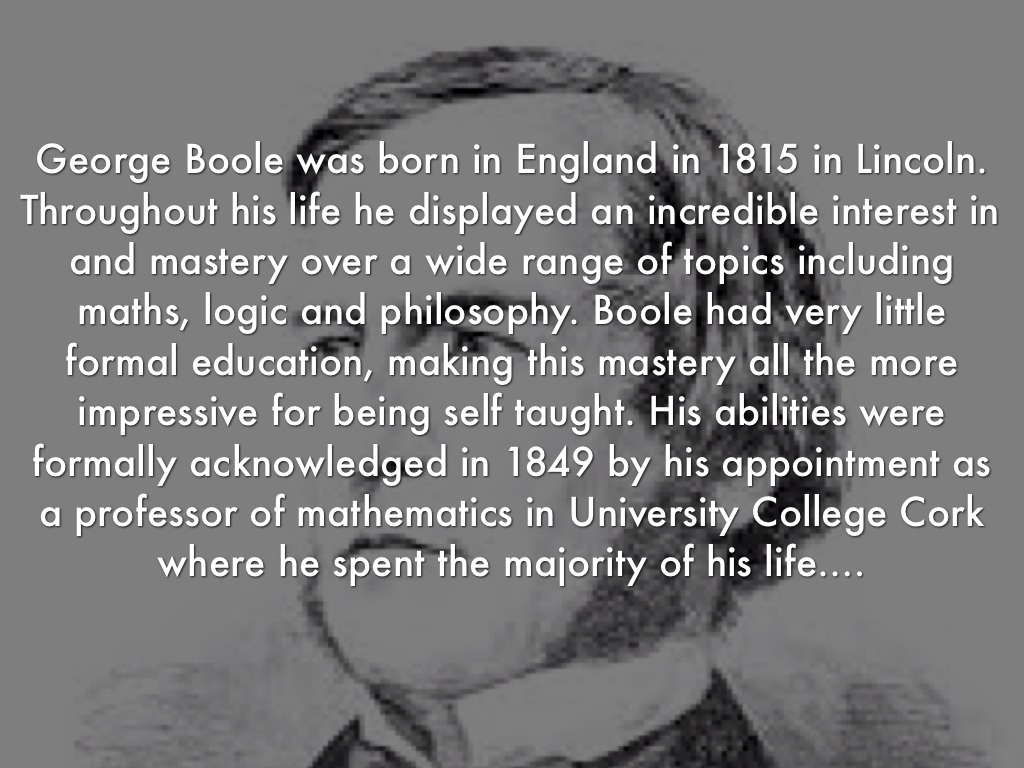 George Boole was born in England in 1815 in Lincoln. Throughout his life he displayed an incredible interest in and mastery over a wide range of topics including maths, logic and philosophy. Boole had very little formal education, making this mastery all the more impressive for being self taught. His abilities were formally acknowledged in 1849 by his appointment as a professor of mathematics in University College Cork where he spent the majority of his life.