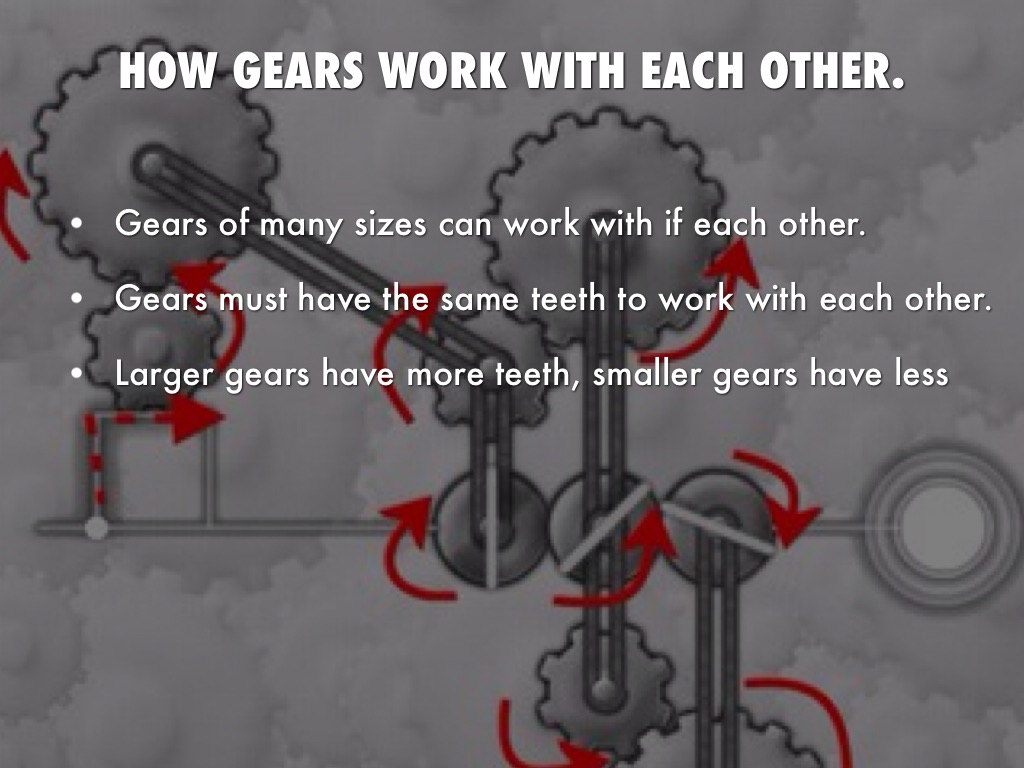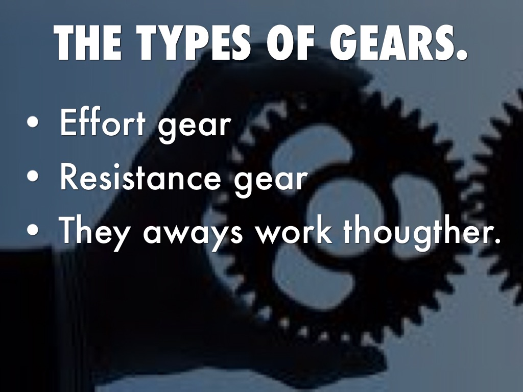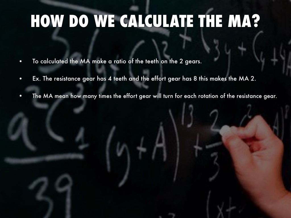 Ex. The resistance gear has 4 teeth and the effort gear has 8 this makes the MA 2.