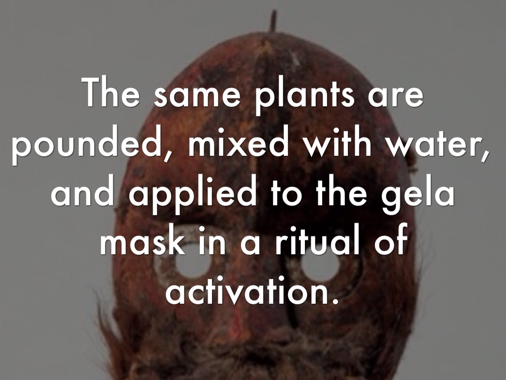 The same plants are pounded, mixed with water, and applied to the gela mask in a ritual of activation.