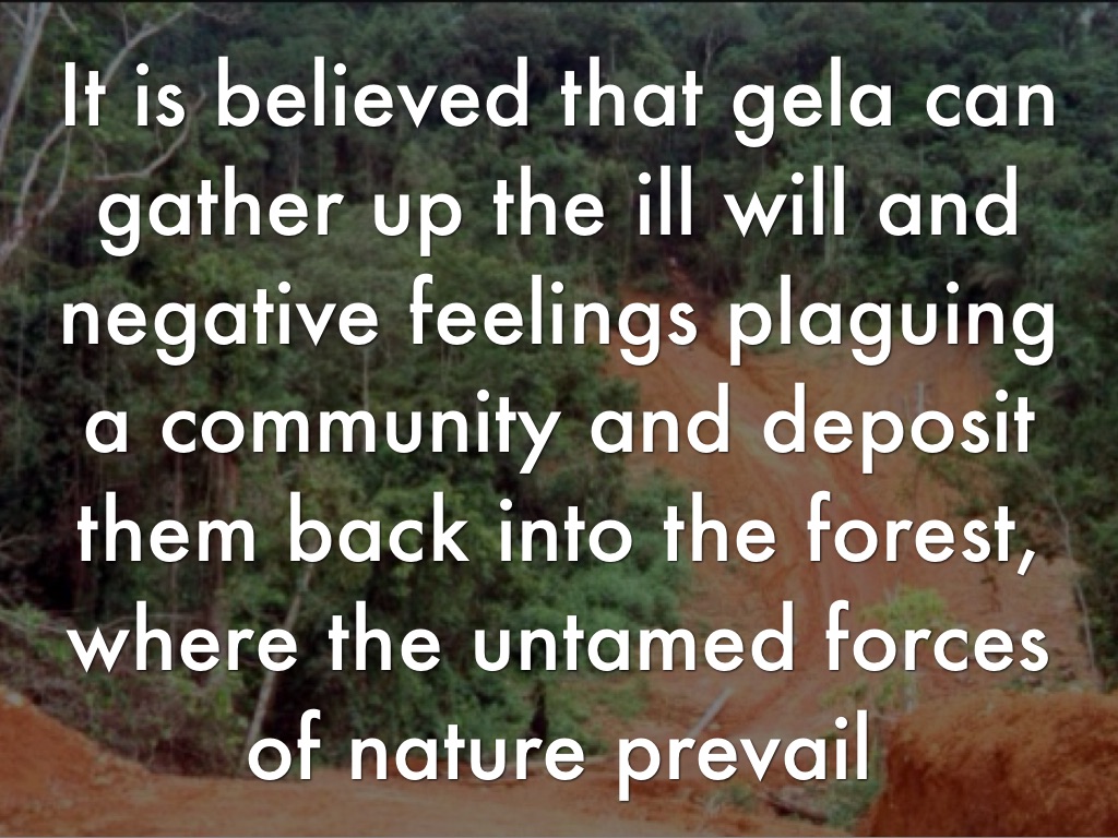 It is believed that gela can gather up the ill will and negative feelings plaguing a community and deposit them back into the forest, where the untamed forces of nature prevail