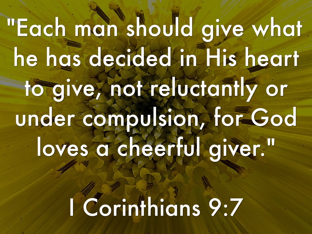 "Each man should give what he has decided in His heart to give, not reluctantly or under compulsion, for God loves a cheerful giver."