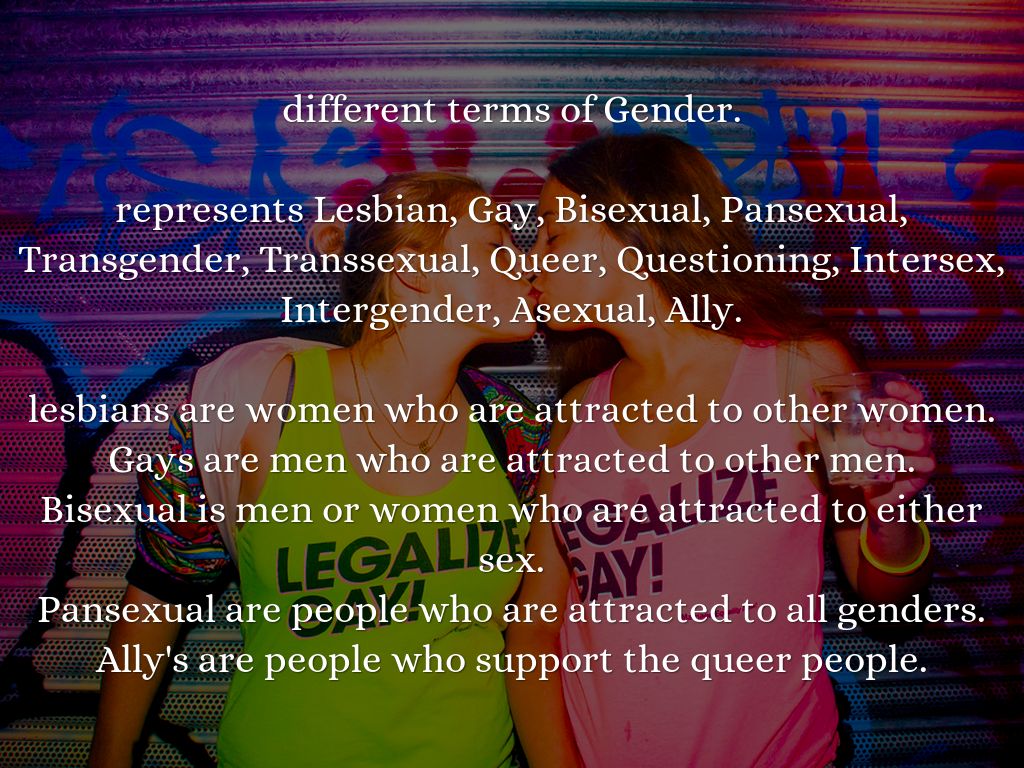 lesbians are women who are attracted to other women. Gays are men who are attracted to other men. Bisexual is men or women who are attracted to either sex. Pansexual are people who are attracted to all genders. Ally's are people who support the queer people.
