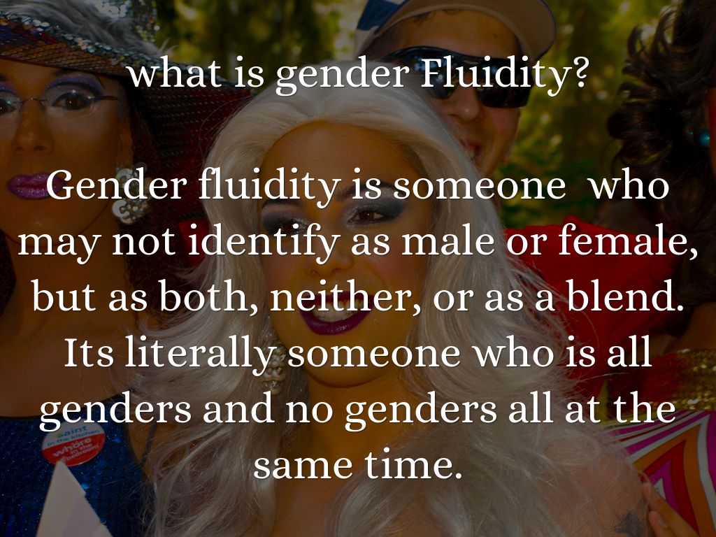 Gender fluidity is someone who may not identify as male or female, but as both, neither, or as a blend. Its literally someone who is all genders and no genders all at the same time.