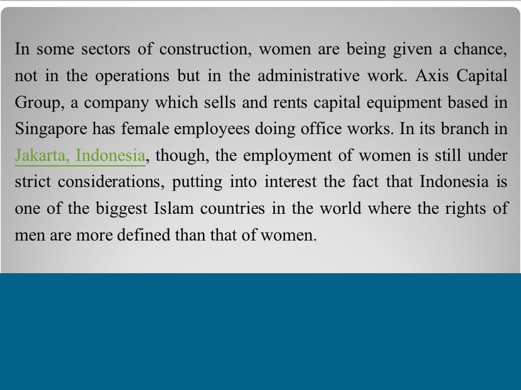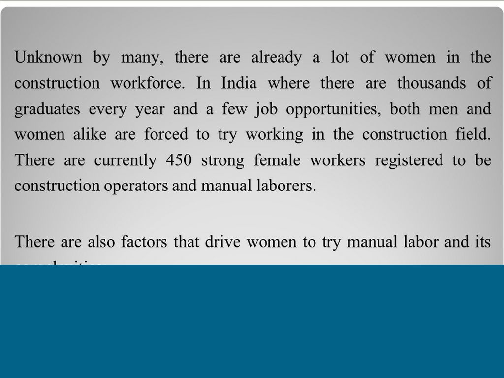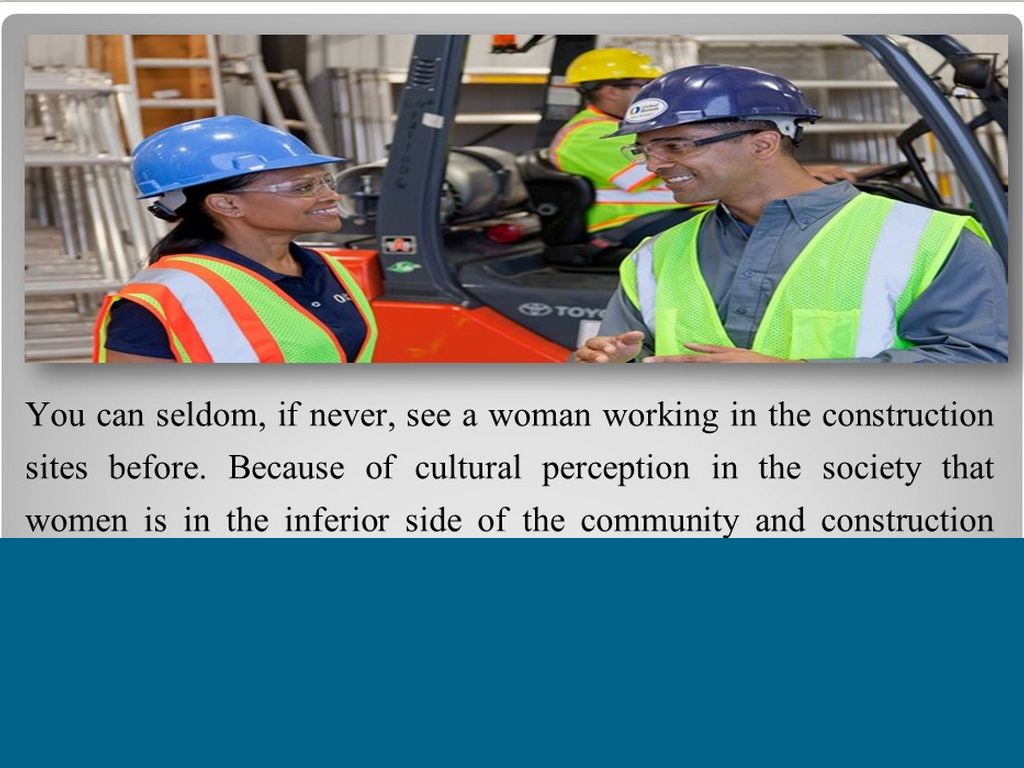 You can seldom, if never, see a woman working in the construction sites before. Because of cultural perception in the society that women is in the inferior side of the community and construction requires manual labor, it is unacceptable for the industry to employ women, even in today’s generation that gender equality is being practiced.