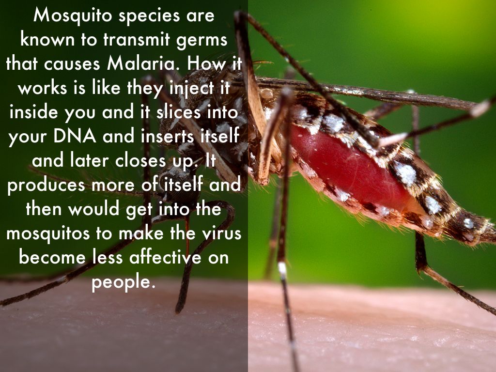 Mosquito species are known to transmit germs that causes Malaria. How it works is like they inject it inside you and it slices into your DNA and inserts itself and later closes up. It produces more of itself and then would get into the mosquitos to make the virus become less affective on people.