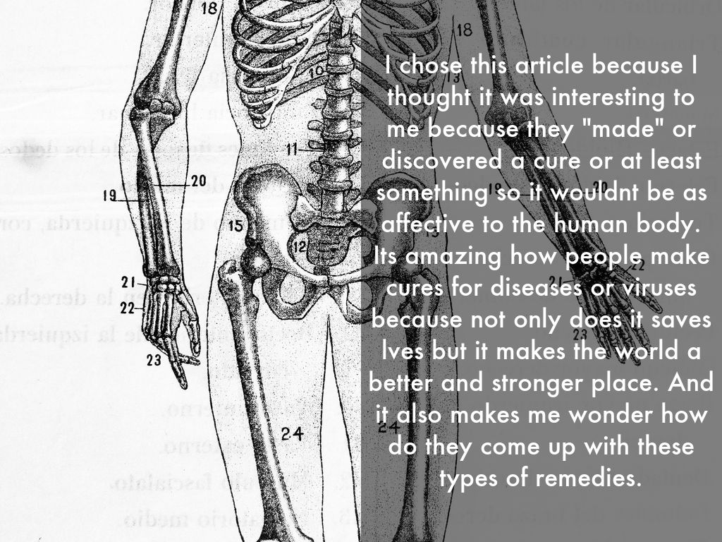 I chose this article because I thought it was interesting to me because they "made" or discovered a cure or at least something so it wouldnt be as affective to the human body. Its amazing how people make cures for diseases or viruses because not only does it saves lves but it makes the world a better and stronger place. And it also makes me wonder how do they come up with these types of remedies.