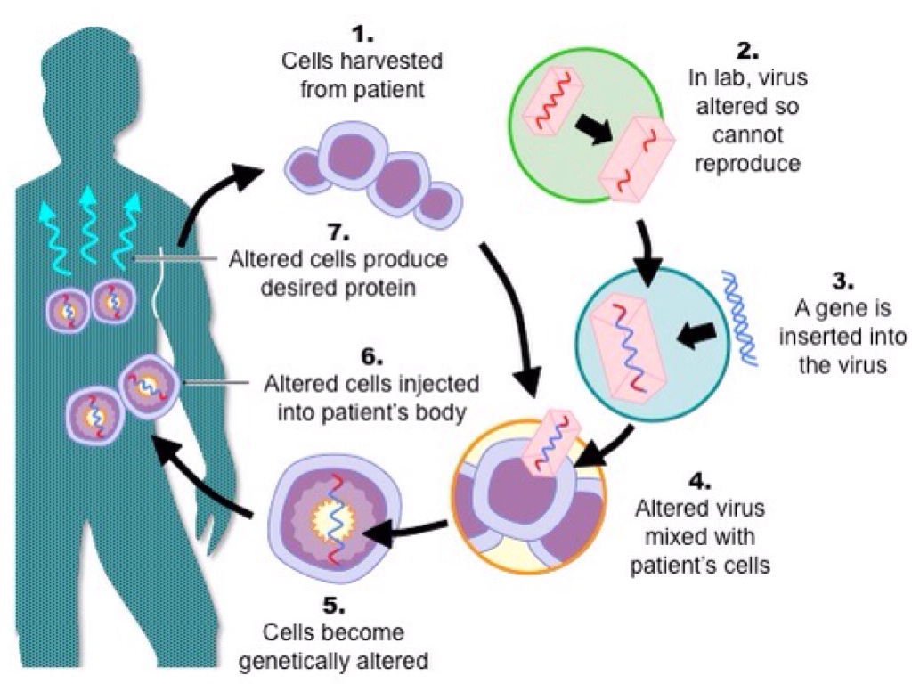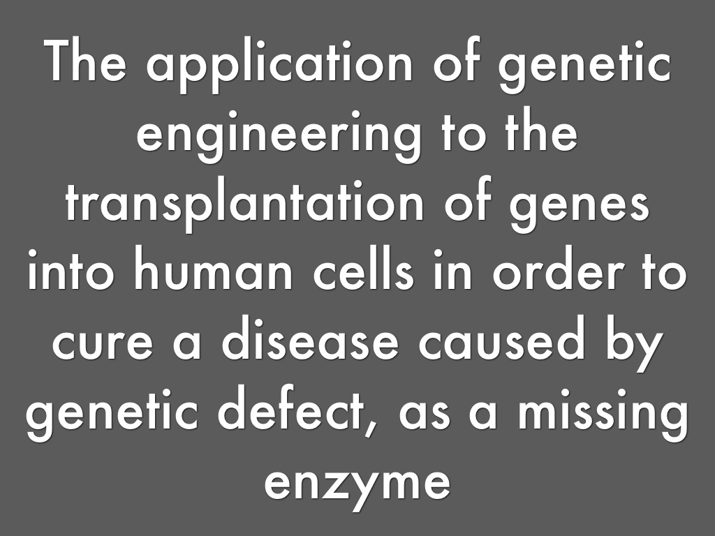 The application of genetic engineering to the transplantation of genes into human cells in order to cure a disease caused by genetic defect, as a missing enzyme