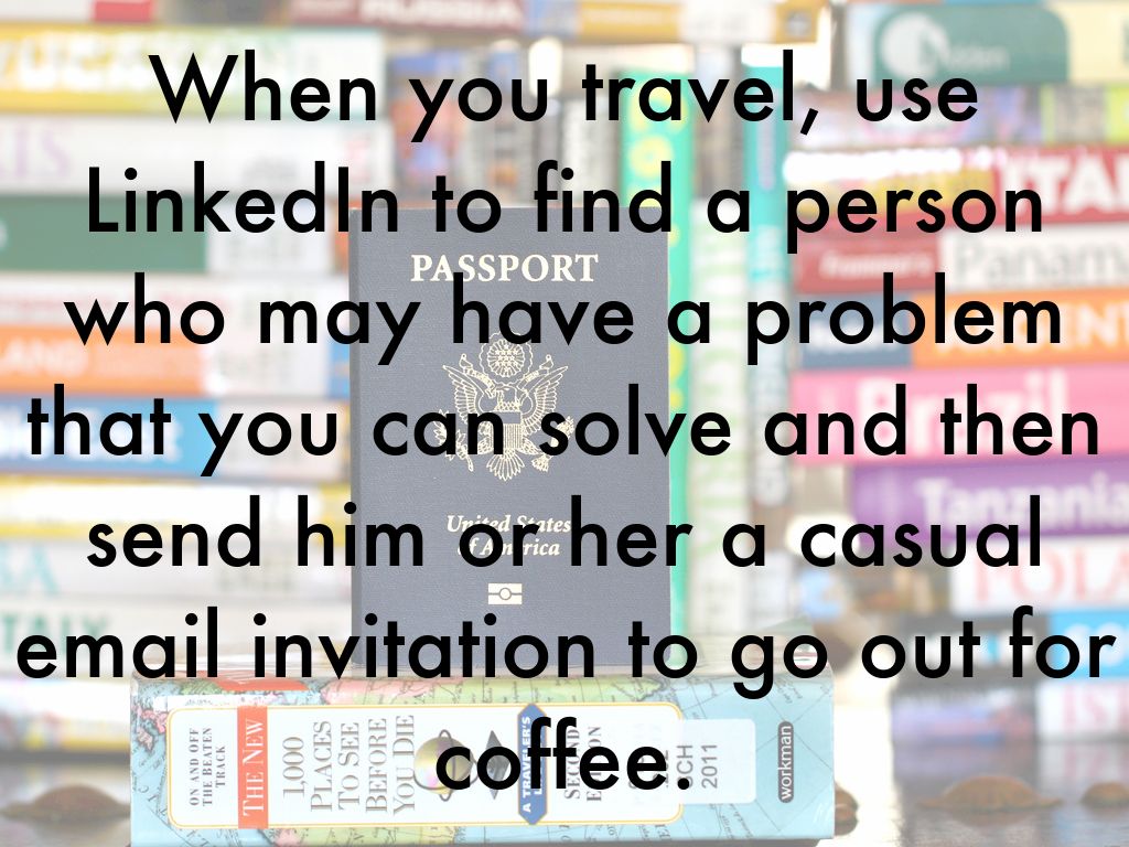 When you travel, use LinkedIn to find a person who may have a problem that you can solve and then send him or her a casual email invitation to go out for coffee.