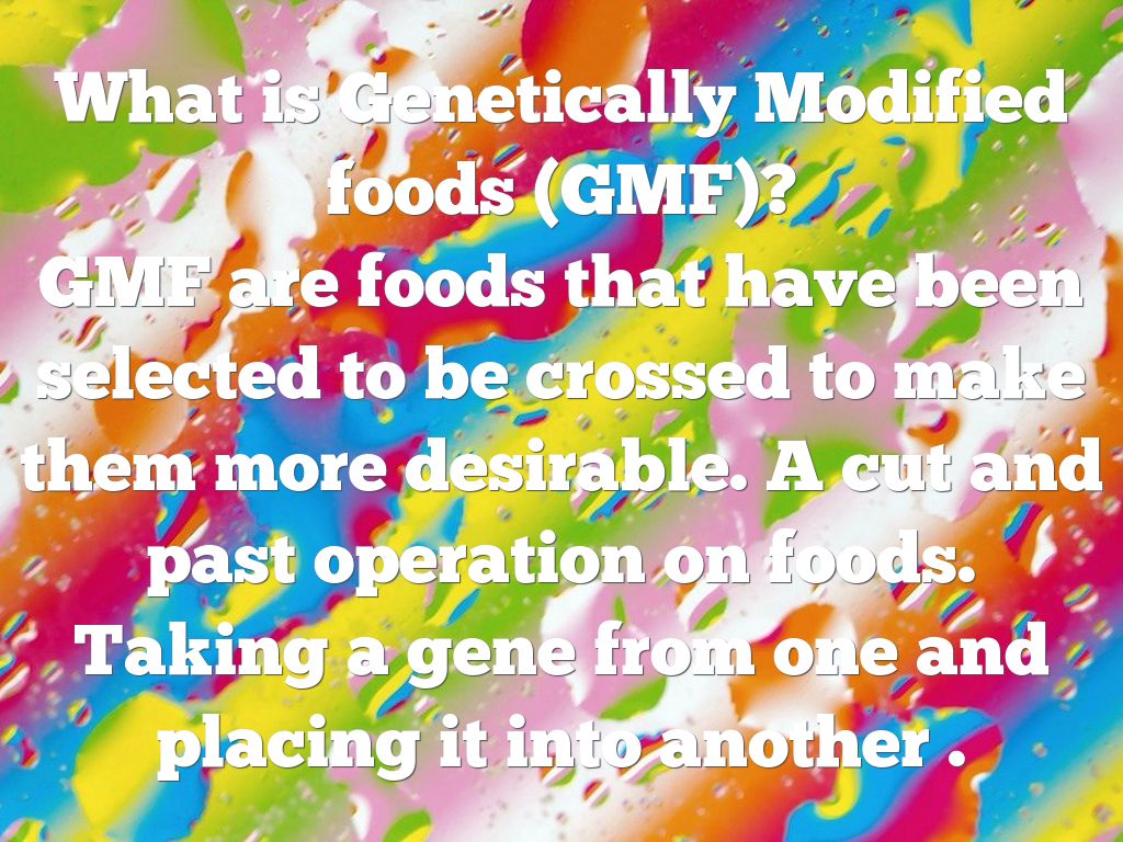 What is Genetically Modified foods (GMF)? GMF are foods that have been selected to be crossed to make them more desirable. A cut and past operation on foods. Taking a gene from one and placing it into another .