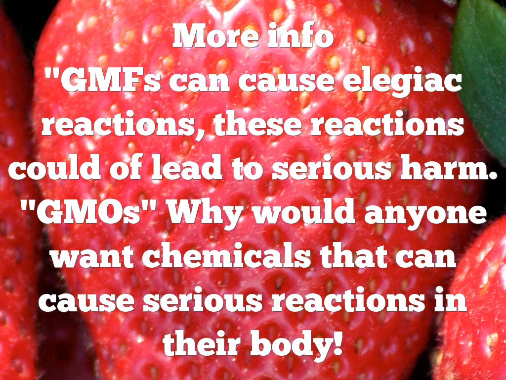 More info "GMFs can cause elegiac reactions, these reactions could of lead to serious harm. "GMOs" Why would anyone want chemicals that can cause serious reactions in their body!