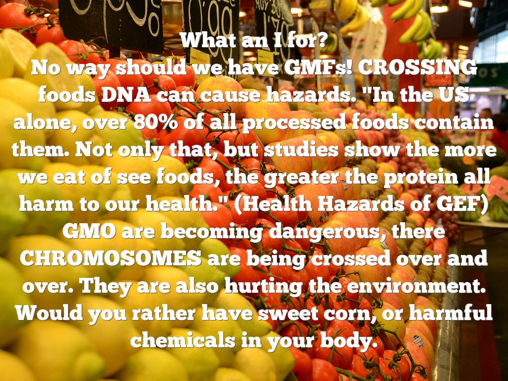 What an I for? No way should we have GMFs! CROSSING foods DNA can cause hazards. "In the US alone, over 80% of all processed foods contain them. Not only that, but studies show the more we eat of see foods, the greater the protein all harm to our health." (Health Hazards of GEF) GMO are becoming dangerous, there CHROMOSOMES are being crossed over and over. They are also hurting the environment. Would you rather have sweet corn, or harmful chemicals in your body.