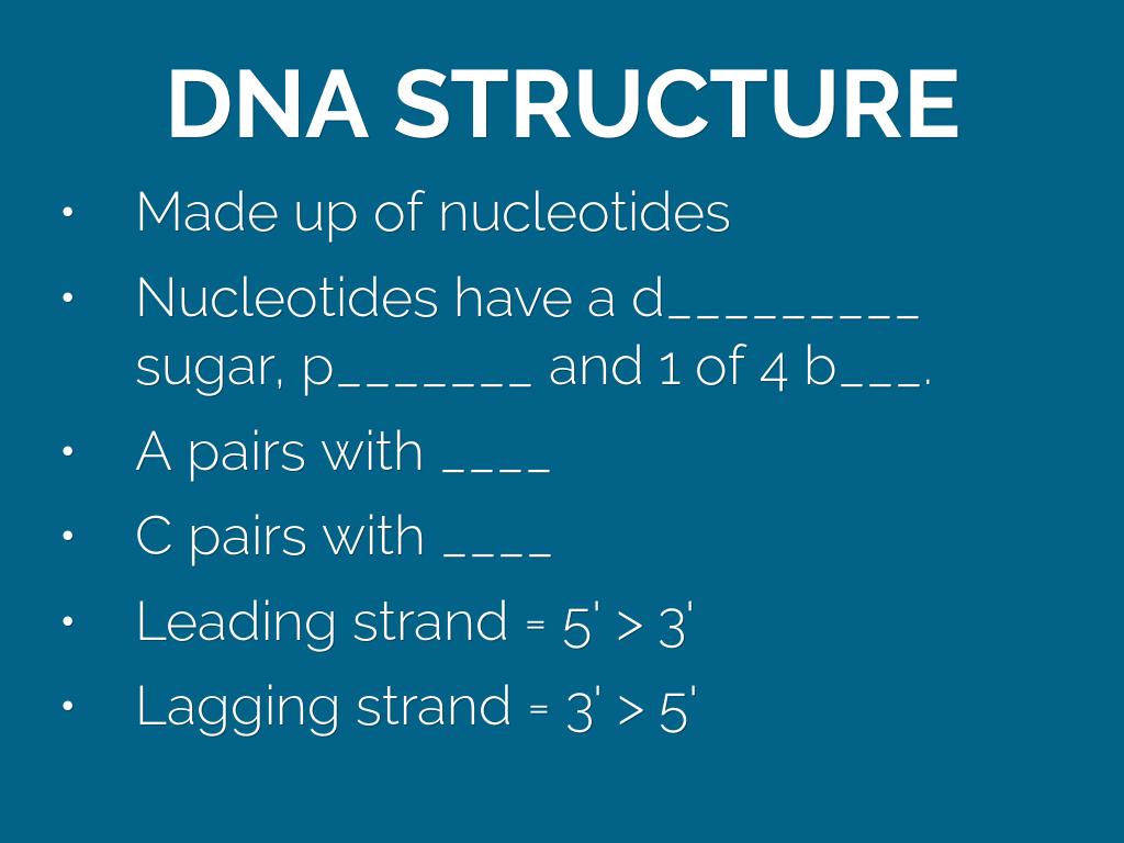 - Nucleotides have a d_________ sugar, p_______ and 1 of 4 b___.