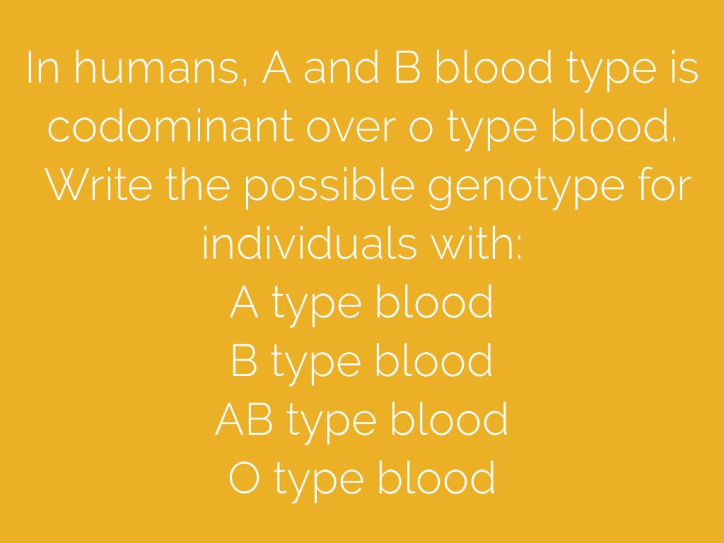 In humans, A and B blood type is codominant over o type blood. Write the possible genotype for individuals with: