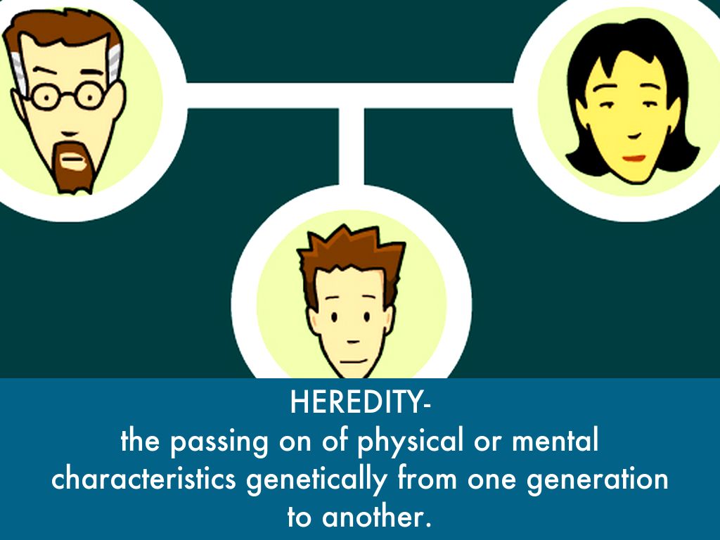 the passing on of physical or mental characteristics genetically from one generation to another.
